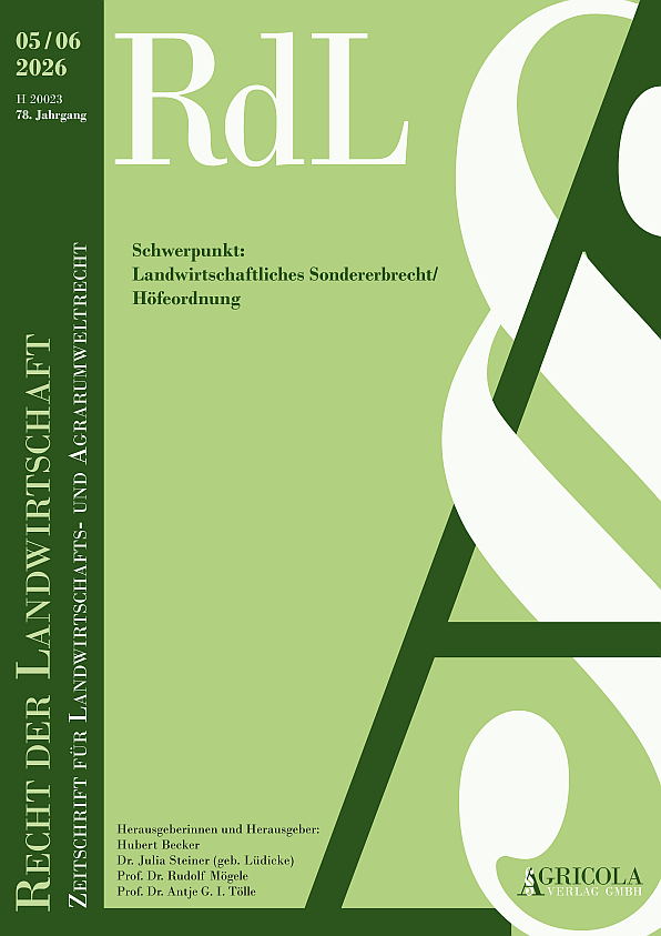 Aktuell, praxisnah und wissenschaftlich fundiert berichtet die RdL über relevante Entwicklungen des Landwirtschafts- und Agrarumweltrechts. Dabei behandelt sie sowohl das Zivil- als auch das Verwaltungsrecht auf Landes-, Bundes- und Europaebene. Neben Fachaufsätzen werden ausgewählte Gerichtsentscheidungen veröffentlicht und kommentiert. Die Themen umfassen das klassische Landwirtschaftsrecht (z. B. Grundstückverkehrs-, Anerben-, Landpacht- und landwirtschaftliches Verfahrensrecht), das Agrarumweltrecht (z. B. Naturschutz-, Klimaschutz-, Erneuerbare Energien-, Immissionsschutz-, Forst- und Wasserrecht), das Tierschutzrecht, das Jagdrecht und das landwirtschaftliche Sozialrecht.